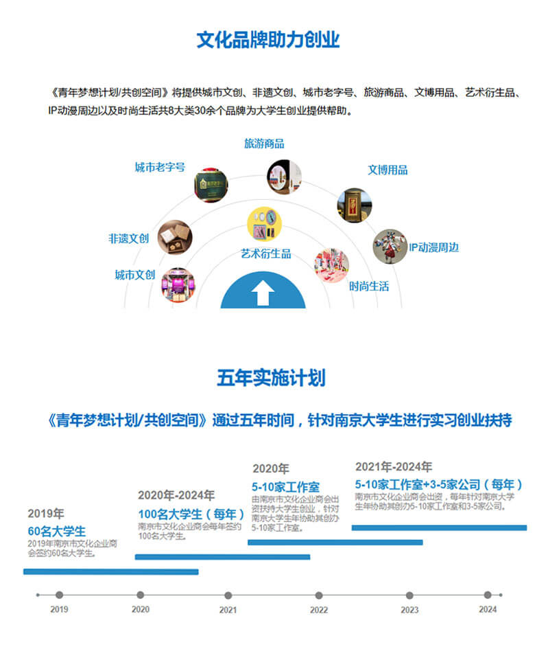 - 2020年,由南京市文化企业商会出资扶持大学生创业,针对南京大学生年协助其创办5-10家工作室。